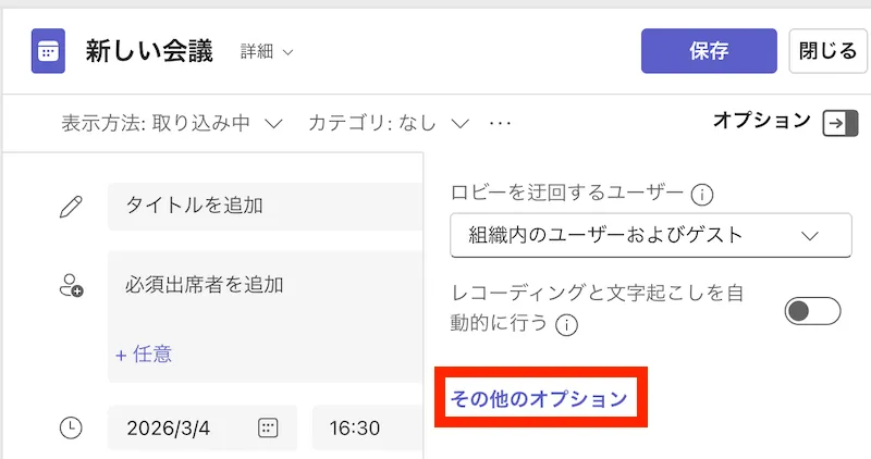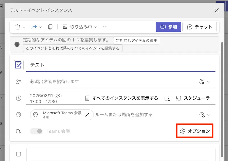 • 新しいイベントとして作成する場合「Teams会議」のトグルがオフであればオンにしてください.