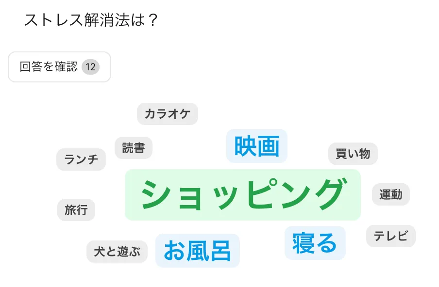 - 回答が図のように表示されます.同一の回答が複数あった場合,その単語が大きく表示されます.(学生側の表示)