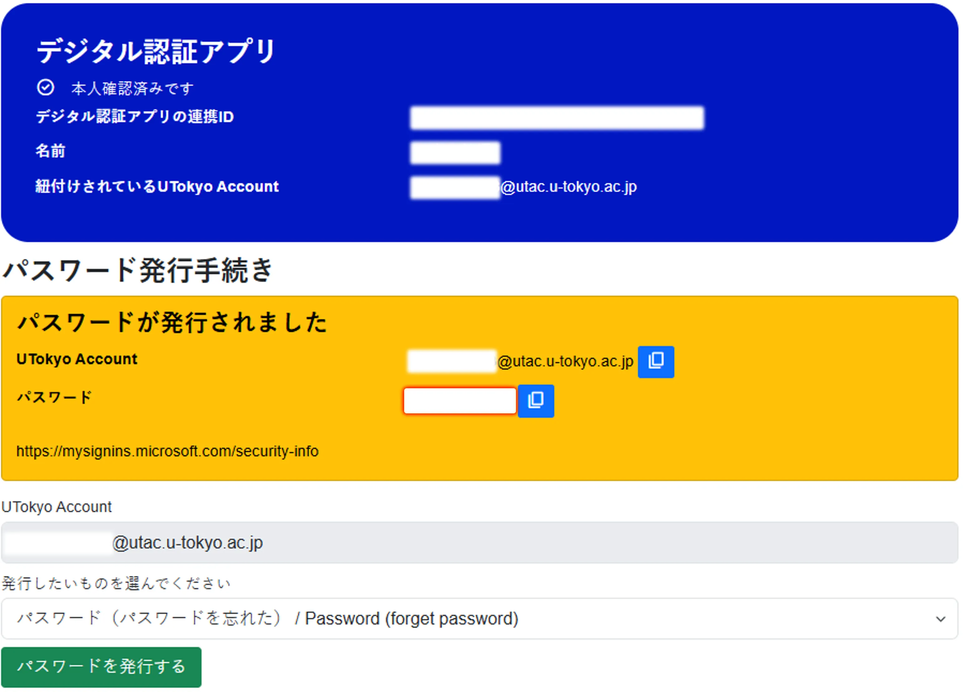 5. 「パスワードが発行されました」と表示されます.表示された仮パスワードをコピーし,UTokyo Accountでの認証が必要なページ(例:セキュリティ情報)にアクセスしてください.